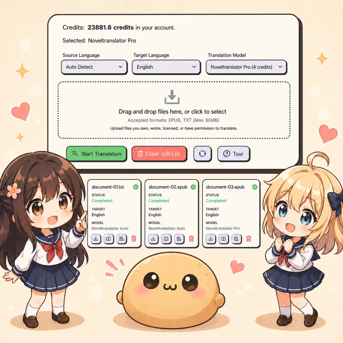 Fixed cost per file upload based on model quality (1 EPUB = 1 file, 1 TXT = 1 file)
